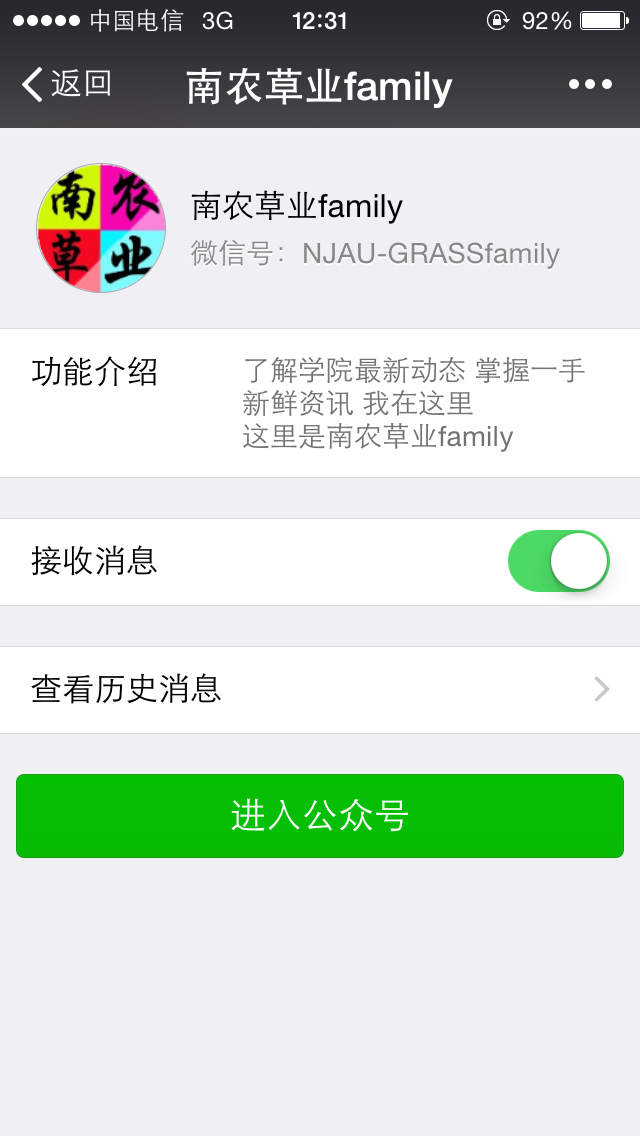 第一步:打开微信扫描该二维码或在搜索框内搜索“南农草业family”