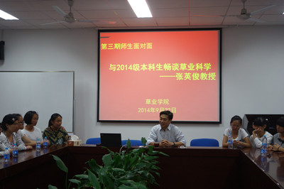 会议伊始,张院长便请同学们提出与学科和个人相关的问题,然后从草业学科的三个主要研究领域,即:草原学、牧草学和草坪学入手,通过讲述国内草原、畜牧业以及草产业的发展现状,分析国内外的草业产业形势和体系,成功解答了同学们对本专业研究领域和就业方向的困惑。在回答问题的过程中张院长又对提问同学们的家乡各地区、区域牧草种植的项目和政策以及就业形势做了详细的解读。