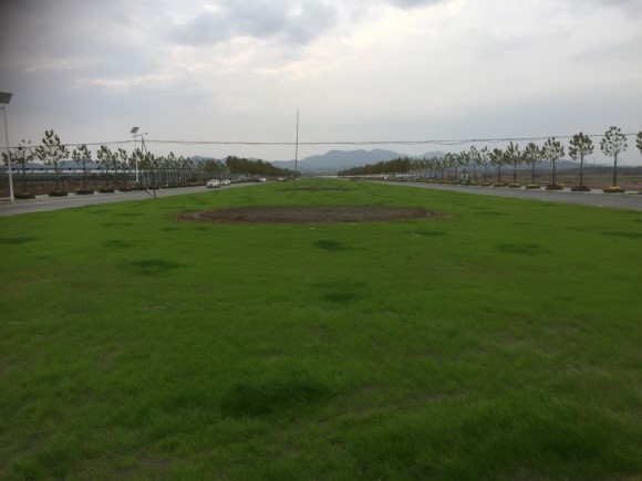 展示基地中间部分南北侧双向通车,中间共有4个区块的绿岛,主体功能为草坪示范区,分别设计为海滨雀稗SeaIsle2000展示区、杂交狗牙根Tifdwarf展示区、高羊茅+草地早熟禾混播草坪展示区、杂交狗牙根Platinum展示区。在各草坪示范区内采取景观化栽培管理的方式种植了18种常见的牧草、观赏草和饲料作物,包括:紫花苜蓿(5个不同品种)、杂花苜蓿、红豆草、斜茎黄芪、小冠花、百脉根、无芒雀麦、猫尾草、果园草、菊苣、串叶松香草、俄罗斯饲料菜、鲁梅克斯、狼尾草、芒颖大麦草等。基地南北两侧共有6个绿化带,主要为豆科牧草展示区,设计了5个区块,分别为:白三叶草展示区、红三叶草展示区、绛三叶草展示区、地被型苜蓿展示区、胡枝子展示区。