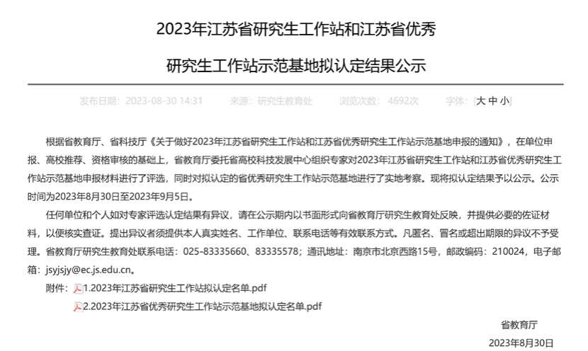 近日,江苏省教育厅、江苏省科技厅公布了2023年江苏省研究生工作站名单,约炮app 合作单位江苏省沿海开发(东台)有限公司顺利入选。江苏省沿海开发(东台)有限公司于2010年10月22日在东台市市场监督管理局登记成立。2020入选“国家级水产健康养殖示范场(第十四批)名单”。2022年1月,入选2019-2021年度江苏省文明单位候选名单。共建数年来,校企共同为研究院研究生实践教育工作的开展提供了强有力的条件保障。