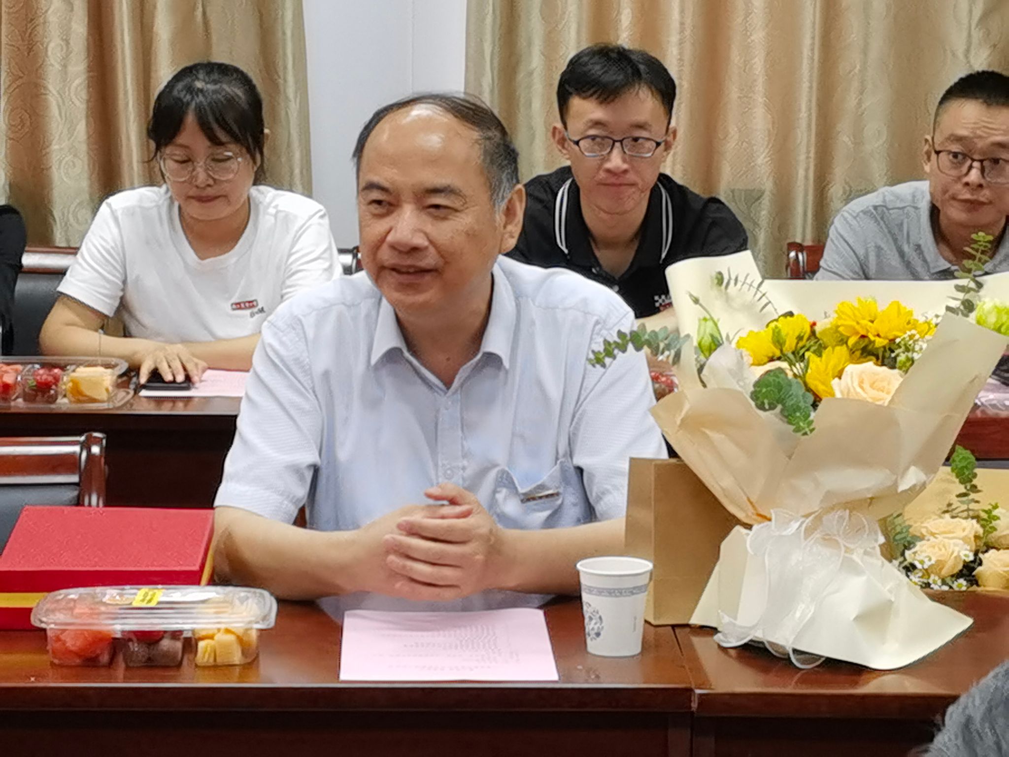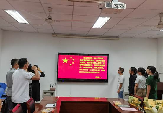座谈会上,院领导为新进青年教师和荣休教师送上鲜花祝福,荣休教师沈益新教授为新入职教师佩戴校徽,并举行了新教师入职宣誓仪式和退休教师荣休仪式。
