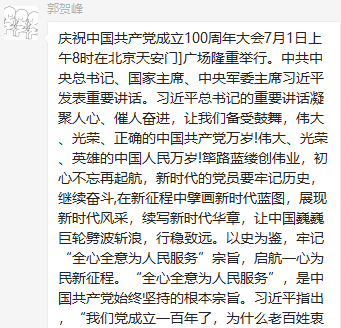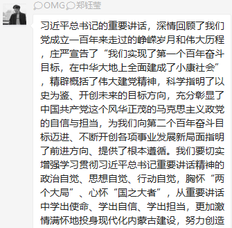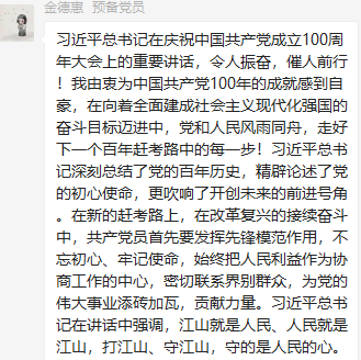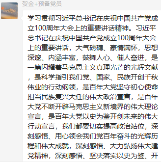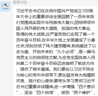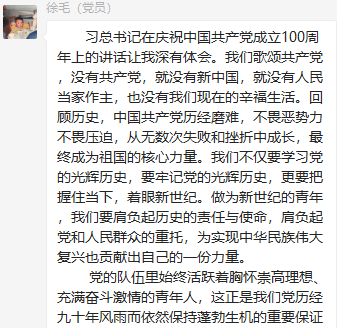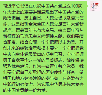董瀛潞同志在约炮app 研究生第三党支部党员群中分享了与习近平总书记在庆祝中国共产党成立100周年大会上的重要讲话相关的资料和视频,党支部各党员在群里积极发表学习心得。中国共产党的先驱们不怕牺牲、英勇斗争,开创了中国历史新纪元。我们要继续弘扬光荣传统、赓续红色血脉,永远把伟大建党精神继承下去并发扬光大。作为新时代的青年党员,我们要以实现中华民族伟大复兴为己任,牢记“请党放心、强国有我”的铮铮誓言,长志气、有骨气、添底气,成为堪当民族复兴重任的社会主义建设者和接班人。