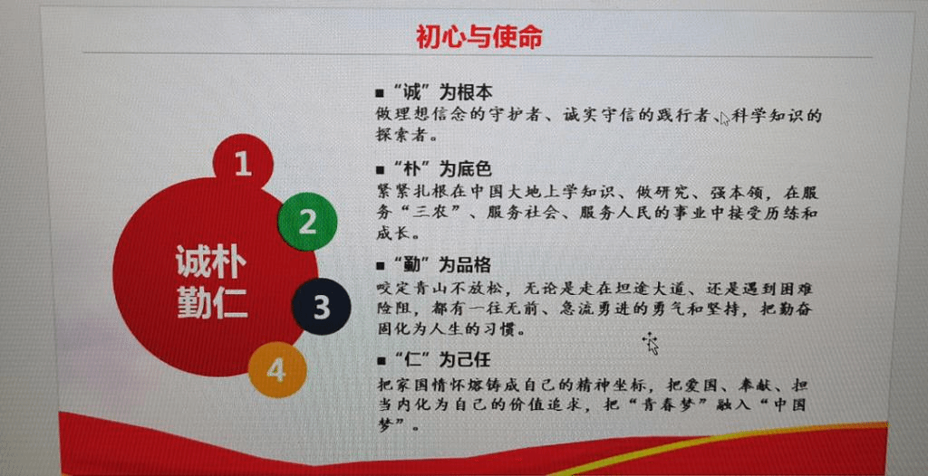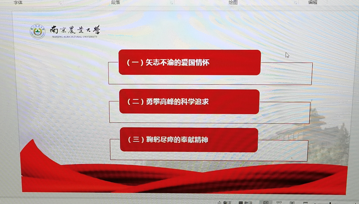 吴智丹以“新农人的使命”为题,分别从“南农大的贡献与影响”、“南农人传承的精神”、“新时代南农人的担当”三个方面讲述了南农大的发展与南农人的精神以及新时代对南农新农人的要求与启示。吴智丹带领大家重温了南农大校史,从三江师范学堂、私立金陵大学到如今的南京农业大学,通过一个又一个先辈的事例,讲述了在曾经的艰苦奋斗中,这些优秀的先辈们留给我们的南农人的精神:矢志不渝的爱国情怀、勇攀高峰的科学追求、鞠躬尽瘁的奉献精神。