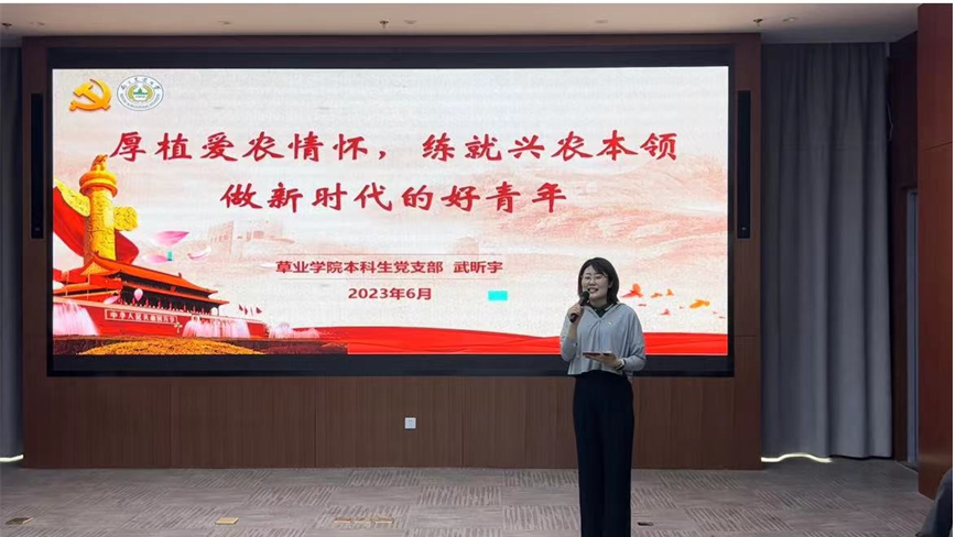 本科生党支部书记武昕宇讲解党课《厚植爱农情怀,练就兴农本领,做新时代的好青年》。党课围绕如何做有理想、有担当、能吃苦、肯奋斗的好青年展开。以黄文秀、新农人代表——魏巧、孙振中夫妇、李寅秋等人为例子,强调作为新时代的草业好青年,更要围绕育人根本任务,树立正确劳动观念;着力实践学用结合,培养堪当大用之才;立足学农知农爱农,立志美丽中国事业;服务产业兴旺战略,引领示范不断创新。