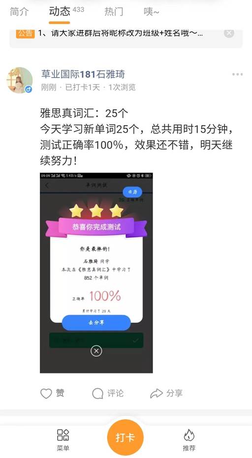 我们办打卡活动的初衷便是激励同学们在家期间也要坚持学习,合理规划时间,给自己充电蓄电,收货自律的成功!