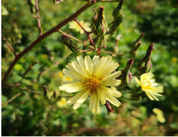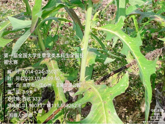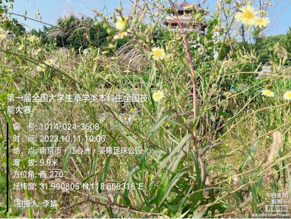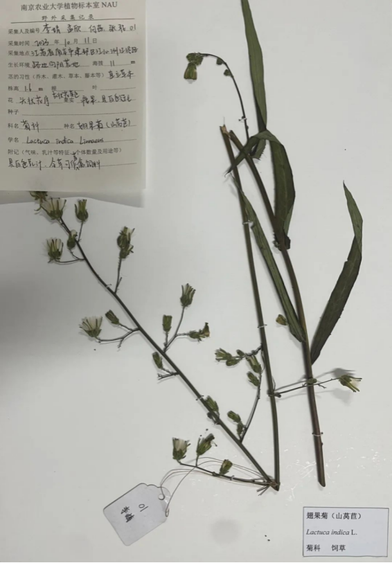 植物标本采集:翅果菊标本采集于江苏省南京市建邺区江心洲江堤路。野外用“今日水印相机”手机APP拍摄植物的生长环境、植物形态特征,并获取经纬度等地理坐标信息,记录植物标本的采集时间、产地、采集人及标本编号、植物重要性状特征及生长环境等基本信息,并将采集号牌系挂在标本上。