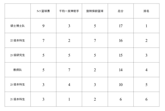 5v5篮球赛共有三轮比赛,初赛通过抽签决定,决出三支获胜的队伍分别是22级本科生队伍、教师队伍和硕士博士研究生队伍。再通过初赛净胜分再复活23级研究生队伍。经过激烈的三轮比赛最终硕士博士队取得决赛的胜利。