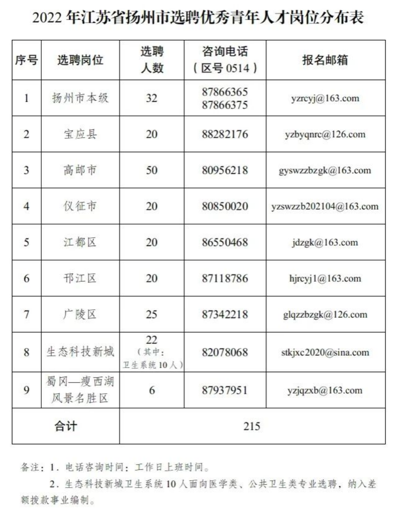 选聘名额:215名。包括扬州市本级岗位32名;宝应县、高邮市、仪征市、江都区、邗江区、广陵区、生态科技新城、蜀冈—瘦西湖风景名胜区岗位合计183名。